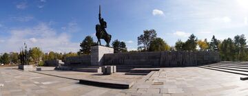 At the beginning of the 8th century, Justinian II visited Dobruja to ask Bulgarian Khan Tervel for military help. Khan Omurtag (815–831) built a "glorious home on the Danube" and erected a mound in the middle of the distance between Pliska and his new building, according to his inscription kept in SS. Forty Martyrs Church in Veliko Tarnovo. The location of this edifice is unclear; the main theories place it at Silistra or at Păcuiul lui Soare.[44] Many early medieval Bulgar stone inscriptions were found in Dobruja, including historical narratives, inventories of armament or buildings, and commemorative texts.[45] During this period Silistra became an important Bulgarian ecclesiastical centre—an episcopate after 865 and seat of the Bulgarian Patriarch at the end of the 10th century.[46] In 895, Magyar tribes from Budjak invaded Dobruja and northeastern Bulgaria. An old Slavic inscription, found at Mircea Vodă, mentions Zhupan Dimitri (Дѣимитрѣ жѹпанѣ), a local feudal landlord prominent in the south of the region in 943.[47]