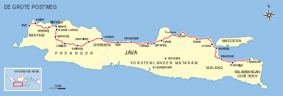 - ^ Daendels (1762–1818), a pro-French Governor-General, originally named the road: La Grand Route. In Indonesian it is called Jalan Raya Pos. A documentary narrated by Indonesian author Pramoedya Ananta Toer was made about the road in 1996. See: [7] Archived 5 أبريل 2017 at the Wayback Machine