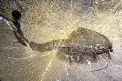 | Spriggina, a possible precursor to the trilobites, may be one of the predators that led to the demise of the Ediacaran fauna[2] and subsequent diversification of animals.[3] | |