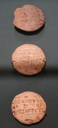 Type IV tablets, also known as "lentils", are circular tablets containing one or a few lines of a composition written out once by the teacher and then a second time by the student. The student's copy appears either underneath the teacher's inscription (typical of Nippur tablets), or on the reverse (more typical of other sites).[26]