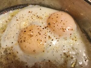 Although the age of the egg and the conditions of its storage have a greater influence, the bird's diet affects the flavor of the egg.[7] For example, when a brown-egg chicken breed eats rapeseed (canola) or soy meals, its intestinal microbes metabolize them into fishy-smelling triethylamine, which ends up in the egg.[7] The unpredictable diet of free-range hens will produce likewise, unpredictable egg flavors.[7] Duck eggs tend to have a flavor distinct from, but still resembling, chicken eggs.