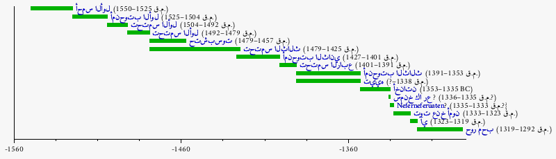 تشير نتائج التأريخ بالكربون المشع إلى أن الأسرة الثامنة عشرة ربما بدأت قبل التاريخ التقليدي لعام 1550 ق.م. بعدة سنوات. يتراوح تاريخ بدايتها وفقًا للكربون المشع بين 1570 و1544 ق.م، ويقع متوسط هذا النطاق عند عام 1557 ق.م.[8]