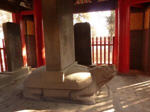 The court did not forget about culture either. During Emperor Yingzong's reign, the re-publishing of sets of Buddhist and Taoist classics was completed. Specifically, in 1440, the Buddhist collection Chinese Buddhist Canon (大藏經, Dàzàngjīng, 'Great Storage of Scriptures') consisting of 6361 volumes in 636 books was published, with a preface written by the emperor. In 1445, the Taoist collection Zhengtong-era Daoist Canon (正統道藏, Zhèngtǒng dàocáng) was published in 481 books of 5305 volumes. Additionally, in 1443, a work on the moral patterns of On the Five Relationships (五倫書, Wǔlúnshū) with 62 volumes was published.[15] The emperor also wrote a preface to the new edition of the Song work on acupuncture Illustrated Manual of Acupuncture Points on a Bronze Figure (铜人腧穴针灸图经, Tóngrén Shùxué Zhēnjiǔ Tújīng) in 3 volumes. This work included text and illustrations engraved in stone and a bronze sculpture with 360 acupuncture points. The original illustrations and statue, created during the Song dynasty, had eroded and faded, so both were remade.[16]