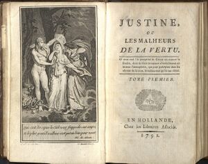 In the late 18th century, such works as Justine, or the Misfortunes of Virtue and 120 Days of Sodom by the Marquis de Sade were exemplars of the theme of sado-masochism and influenced later erotic accounts of sadism and masochism in fiction. De Sade (as did the later writer Sacher-Masoch) lent his name to the sexual acts which he describes in his work.