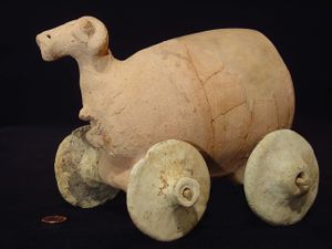 A8911 - لعبة أطفال أكدية، برأس كبش، تـُجـَر على عجل. عثرت عليها بعثة تنقيب من المعهد الشرقي بشيكاغو، في أطلال إشنونا (تل أسمر الحالية) بالعراق، في حفريات أُجريت في ع1930.
