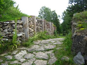 Estonia had two regional cultures in this period. Northern and western coastal areas maintained close connections with Scandinavia, while the inland had stronger ties to the Balts and the principality of Pskov.[54] Viking Age Estonia participated actively in trade, including exports of iron, furs, and honey. They imported fine goods like silk, jewelry, glass, and Ulfberht swords. Evidence of ancient harbour sites has been found along the coast of Saaremaa.[55] This era's Estonian burial sites often contain both individual and collective graves, with artefacts like weapons and jewelry reflecting the shared material culture of Scandinavia and Northern Europe.[55][56]