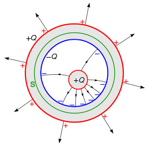 An important conclusion that can be drawn from this is that the net charge inside a closed conducting container is always zero, even if a charged object is put in.[4] If the charge inside can find a conducting path to the container wall, it will flow to the outside surface of the container due to its mutual repulsion. If it cannot, the interior charge will induce an equal and opposite charge on the inside surface, so the net charge inside is still zero. Any net charge on a conducting object is located on its surface.