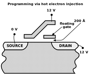 - the source-drain current is sufficiently high to cause some high energy electrons to jump through the insulating layer onto the FG, via a process called hot-electron injection.
