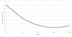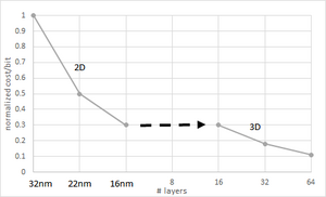 The wafer cost of a 3D NAND is comparable with scaled down (32 nm or less) planar NAND Flash.[90] However, with planar NAND scaling stopping at 16 nm, the cost per bit reduction can continue by 3D NAND starting with 16 layers. However, due to the non-vertical sidewall of the hole etched through the layers; even a slight deviation leads to a minimum bit cost, i.e., minimum equivalent design rule (or maximum density), for a given number of layers; this minimum bit cost layer number decreases for smaller hole diameter.[91]