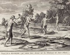 دخل الشعب المعروف بإسم الهنود العتاق فلوريدا قبل ما يزيد عن 14,000 سنة.[13] وبحلول القرن السادس عشر، وهو أقدم وقت توجد منه سجلات تاريخية، كانت هناك جماعات رئيسية من الناس تعيش في فلوريدا تضم الأپالاتشي في مقبض مقلاة فلوريدا، والتيموكوا في شمال ووسط فلوريدا، و الآيس في الساحل الأطلسي الأوسط، و كالوسا في جنوب غرب فلوريدا.[14]