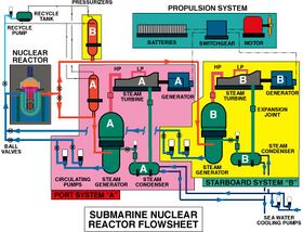 In the second definition the meaning is limited to the representation of the physical route or flow. An example of such a diagram is the illustration of the flows in a nuclear submarine propulsion system, which shows different streams back and forth in the system. The representation of such a system can be supplemented by one or more flowcharts, which show the sequence of one of the flows in one direction, or any of the control flows to manage the system.