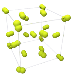 Fluorine has two solid forms, α- and β-fluorine. The latter crystallizes at −220 °C (−364 °F) and is transparent and soft, with the same disordered cubic structure of freshly crystallized solid oxygen,[45][note 2] unlike the orthorhombic systems of other solid halogens.[49][50] Further cooling to −228 °C (−378 °F) induces a phase transition into opaque and hard α-fluorine, which has a monoclinic structure with dense, angled layers of molecules. The transition from β- to α-fluorine is more exothermic than the condensation of fluorine, and can be violent.[49][50][note 3]