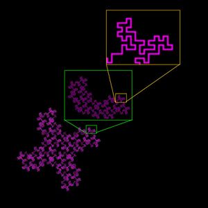 Figure 6. Two L-systems branching fractals that are made by producing 4 new parts for every 1/3 scaling so have the same theoretical as the Koch curve and for which the empirical box counting has been demonstrated with 2% accuracy.[1]