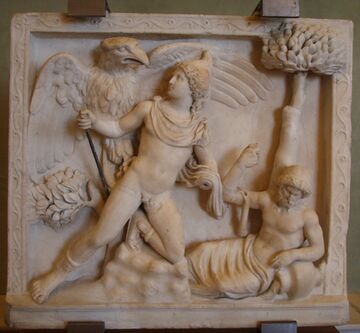 Ganymede and Zeus in the guise of an eagle were a popular subject on Roman funerary monuments with at least 16 sarcophagi depicting this scene.[38]