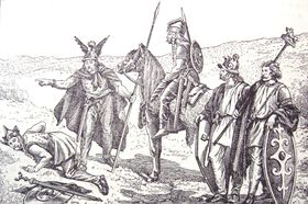 الغال تحت Brennus sacked Rome circa 390 BC. In the Aegean world, a huge migration of Eastern Gauls appeared in Thrace, north of Greece, in 281 BC. Another Gaulish chieftain also named Brennus, at the head of a large army, was only turned back from desecrating the Temple of Apollo at Delphi in Greece at the last minute — he was alarmed, it was said, by portents of thunder and lightning.[1] At the same time a migrating band of Celts, some 10,000 warriors, with their women and children and slaves, were moving through Thrace. Three tribes of Gauls crossed over from Thrace to Asia Minor at the express invitation of Nicomedes I, king of Bithynia (which was a small geographical location just south of the Bosphorus and the Euxine (Black Sea) in the northern area of modern-day Turkey, i.e just south and southeast of the latter-day city of Constantinople, or modern-day Istanbul), who required help in a dynastic struggle against his brother. Eventually they settled down in eastern Phrygia and Cappadocia in central Anatolia, a region henceforth known as Galatia.