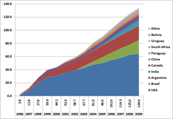 - ^ أ ب Field areas 2009: Genetically modified plants: Global cultivation on 134 million hectares GMO Compass, March 29, 2010. Retrieved August 11, 2010.
