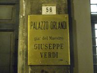 Verdi paid close attention to his financial contracts, making sure he was appropriately remunerated as his popularity increased. For I Lombardi and Ernani (1844) in Venice he was paid 12,000 lire (including supervision of the productions); Attila and Macbeth (1847), each brought him 18,000 lire. His contracts with the publishers Ricordi in 1847 were very specific about the amounts he was to receive for new works, first productions, musical arrangements, and so on.[29] He began to use his growing prosperity to invest in land near his birthplace. In 1844 he purchased "Il Pulgaro", 62 acres (23 hectares) of farmland with a farmhouse and outbuildings, providing a home for his parents from May 1844. Later that year, he also bought the Palazzo Cavalli (now known as the Palazzo Orlandi) on the via Roma, Busseto's main street.[30] In May 1848, Verdi signed a contract for land and houses at Sant'Agata in Busseto, which had once belonged to his family.[31] It was here he built his own house, completed in 1880, now known as the Villa Verdi, where he lived from 1851 until his death.[32]