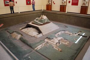 The Courtyard of Altars is a complex of buildings adjoining the south side of the pyramid.[19] It was one of the most important finds of the 1967 to 1970s round of excavation, named such because of several altars found here. Eduardo Matos Moctezuma had begun to touch on this area with his excavation of Edifico I in 1966 and 1967. The structure consists of a very large open area measuring seventy by fifty-four meters, bordered by the pyramid proper to the north, and on the east and west sides by two complicated raised platforms, named Patio Sureste and Gran Plaza Suroeste by the excavators. These platforms are similar to those in the Northeast plaza, but they are up against the side of the main pyramid, which was done to amplify the patio's hierarchical and ritual nature. The area was mostly likely used for large, spectacular ceremonies as well as for rites associated with the passing of power. The taluds are wide, which is characteristic of Cholula, and decorated with moldings consisting of T formations. The tableros were painted with aquatic symbols and bands of red, blue, yellow and black. The access to the two main platforms and the side of the pyramid are marked by wide stairs. The Gran Plaza Suroeste shows strong Teotihuacan influence, with four rooms over taluds that surround a patio. One of these rooms contains a model of a pyramid base that may represent the Gran Pyramid in miniature.[43] Excavations have revealed that these annexes were built up in a series of at least six construction phases, enclosing a central courtyard.[19] As new phases of construction took place, newer versions of buildings were built over the pre-existing version, covering the lower part and adding a new or modified facade, resulting in the reduction of the courtyard area by the gradual encroachment of the surrounding structures and added several metres to the original platform height.[44] These are buildings were arranged on the east and west sides of an early 82-متر (270 ft) wide platform.[19] Further structures were built against the rear facades of these buildings, forming two wide side plazas.[44] The buildings that can be seen today date to the latest construction phase of the courtyard.[44] Buildings on this south side contain significant mural work, including patterns on the various constructions associated with Building 3 (Building 3-1-A, Building 3–2, etc.). It also includes the only mural with anthropomorphic figures, called the Mural of the Drinkers.[45]
