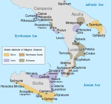 Magna Graecia[8] was the name given by the Romans to the coastal areas of Southern Italy in the present-day Italian regions of Calabria, Apulia, Basilicata, Campania and Sicily; these regions were extensively populated by Greek settlers.[9]