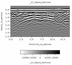 GPR depth section (profile) showing a single line of data from the survey of the historic crypt shown above. The domed roof of the crypt can be seen between 1 and 2.5 meters below surface.