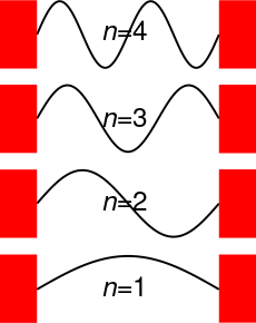 - The wave function of the ground state of a particle in a one-dimensional box is a half-period sine wave, which goes to zero at the two edges of the well. The energy of the particle is given by , where h is the Planck constant, m is the mass of the particle, n is the energy state (n = 1 corresponds to the ground-state energy), and L is the width of the well.