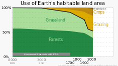 لكن هذه الغابات الجوهريّة لوُجود الحياة على الكوكب تُقطع حالياً بسرعة كبيرة لأغراض مُختلفة، منها تفريغ مساحات لإتاحة توسع المُدن أو زرع العُشب لتقات عليه الماشية، أما الأشجار المَقطوعة فهي تُباع لكي تصنع منها أوراق للكتابة والطباعة أو أثاث منزليّ متنوع.[57] وفي الوقت الحاضر وَصَلت مُعدلات قطع الأشجار إلى أرقام عالية جداً مع التضخم السكاني حول العالم، فالأشجار تقطع الآن بمُعدل هكتار في كل ثانية، مما يَعني أن غابة مساحتها تعادل مساحة مدينة طوكيو اليابانية تقطع كل يوم (250 كم2 تقريباً)، وهذا يُساوي مساحة 320,000 كم2 في العام، وهي مساحة تتجاوز مساحة دولة بولندا الأوروبية.