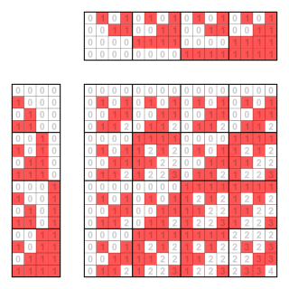 If we map the elements of the Hadamard matrix using the group homomorphism , where is the additive group of the field with two elements, we can describe an alternative construction of Sylvester's Hadamard matrix. First consider the matrix , the matrix whose columns consist of all n-bit numbers arranged in ascending counting order. We may define recursively by