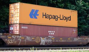 Hapag-Lloyd 40' container stacked on intermodal train