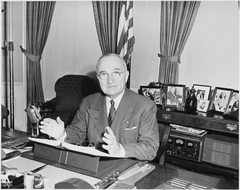 هاري ترومان إنگليزية: Harry S. Truman؛(8 مايو 1884 - 26 ديسمبر 1972)، هو الرئيس الثالث والثلاثون للولايات المتحدة الأمريكية، تولى المنصب من 12 أبريل 1945 حتى 20 يناير 1953، كان ترومان يشغل منصب نائب الرئيس الأمريكي لمدة 82 يوم ثم تولى الرئاسة خلفاً للرئيس فرانكلين روزفلت الذي توفي في المنصب، وكان عضواً في مجلس الشيوخ الأمريكي عن ولاية ميسوري (1935-1945) ، أشرف ترومان على إنهاء الحرب العالمية الثانية واستسلام كلٍ من ألمانيا النازية واليابان، كما أمر بإطلاق قنبلتي هيروشيما وناجازاكي في أغسطس 1945، وعمل على إنشاء منطقة حلف شمال الأطلسي "حلف الناتو" في عام 1949، كذلك بدأت في عهده الحرب الباردة بين الولايات المتحدة والاتحاد السوفيتي، كما ساهم في التدخل العسكري في الحرب الكورية عام 1950.