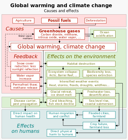 Human impact on the environment (or anthropogenic environmental impact) refers to changes to biophysical environments[1] and to ecosystems, biodiversity, and natural resources[2] caused directly or indirectly by humans. Modifying the environment to fit the needs of society (as in the built environment) is causing severe effects[3][4] including global warming,[1][5][6] environmental degradation[1] (such as ocean acidification[1][7]), mass extinction and biodiversity loss,[8][9][10] ecological crisis, and ecological collapse. Some human activities that cause damage (either directly or indirectly) to the environment on a global scale include population growth,[11][12][13] neoliberal economic policies[14][15][16] and rapid economic growth,[17] overconsumption, overexploitation, pollution, and deforestation. Some of the problems, including global warming and biodiversity loss, have been proposed as representing catastrophic risks to the survival of the human species.[18][19]
