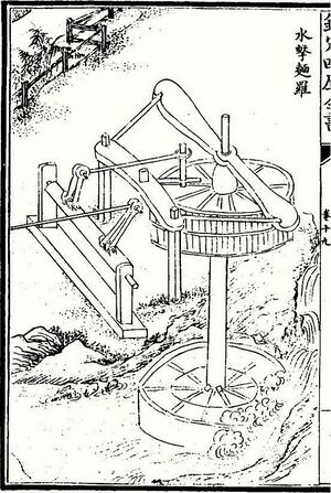 Water-powered trip hammers and bellows in China, during the Han dynasty (202 BC – 220 AD), were initially thought to be powered by water scoops.[15]:26–30 However, some historians suggested that they were powered by waterwheels. This is since it was theorized that water scoops would not have had the motive force to operate their blast furnace bellows.[20] Many texts describe the Hun waterwheel; some of the earliest ones are the Jijiupian dictionary of 40 BC, Yang Xiong's text known as the Fangyan of 15 BC, as well as Xin Lun, written by Huan Tan about 20 AD.[21] It was also during this time that the engineer Du Shi (c. AD 31) applied the power of waterwheels to piston-bellows in forging cast iron.[21]