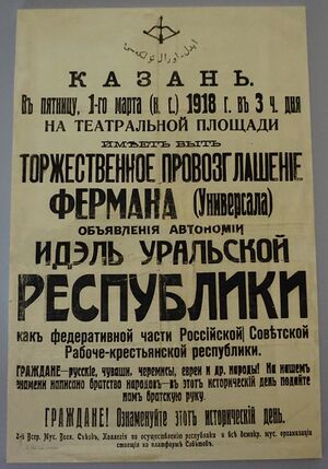 The Idel-Ural State (تتارية: Идел-Урал өлкәсе,[بحاجة لمصدر] İdel-Ural ölkäse, ادیل-اورال اولكسی, also İdel-Ural berlege İdel-Ural ştatı), also known as the Volga-Ural State or Idel-Ural Republic,[3] was a short-lasting autonomy of Tatar peoples that claimed to unite the Tatars, Bashkirs, and Chuvash in the turmoil of the Russian Civil War. The republic was proclaimed on 1 March 1918, by a Congress of Muslims from Russia's interior and Siberia, but defeated by Bolsheviks the same month.[4] Idel-Ural means "Volga-Ural" in the Tatar language.