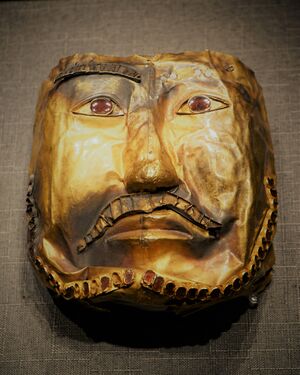 A golden mask inlaid with rubies, likely from the First Turkic Khaganate (552–603). It was excavated at the Boma tomb in Zhaosu County and is a part of the Ili Prefecture Museum's collection.[4]  |