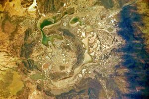 On Earth, impact craters have resulted in useful minerals. Some of the ores produced from impact related effects on Earth include ores of iron, uranium, gold, copper, and nickel. It is estimated that the value of materials mined from impact structures is five billion dollars/year just for North America.[28] The eventual usefulness of impact craters depends on several factors, especially the nature of the materials that were impacted and when the materials were affected. In some cases, the deposits were already in place and the impact brought them to the surface. These are called "progenetic economic deposits." Others were created during the actual impact. The great energy involved caused melting. Useful minerals formed as a result of this energy are classified as "syngenetic deposits." The third type, called "epigenetic deposits," is caused by the creation of a basin from the impact. Many of the minerals that our modern lives depend on are associated with impacts in the past. The Vredeford Dome in the center of the Witwatersrand Basin is the largest goldfield in the world, which has supplied about 40% of all the gold ever mined in an impact structure (though the gold did not come from the bolide).[29][30][31][32] The asteroid that struck the region was 9.7 km (6 mi) wide. The Sudbury Basin was caused by an impacting body over 9.7 km (6 mi) in diameter.[33][34] This basin is famous for its deposits of nickel, copper, and platinum group elements. An impact was involved in making the Carswell structure in Saskatchewan, Canada; it contains uranium deposits.[35][36][37] Hydrocarbons are common around impact structures. Fifty percent of impact structures in North America in hydrocarbon-bearing sedimentary basins contain oil/gas fields.[38][28]. Also the Siljan impact crater in Sweden has hydrocarbon occurrences [39].