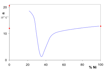 Common grades of Invar have a coefficient of thermal expansion (denoted α, and measured between 20 °C and 100 °C) of about 1.2 × 10−6 K−1 (1.2 ppm/°C), while ordinary steels have values of around 11–15 ppm/°C.[بحاجة لمصدر] Extra-pure grades (<0.1% Co) can readily produce values as low as 0.62–0.65 ppm/°C.[بحاجة لمصدر] Some formulations display negative thermal expansion (NTE) characteristics.[بحاجة لمصدر] Though it displays high dimensional stability over a range of temperatures, it does have a propensity to creep.[6][7]