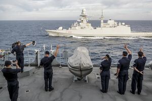 Crew of HMS Albion wave to Italian frigate Carlo Bergamini during exercise in 2020