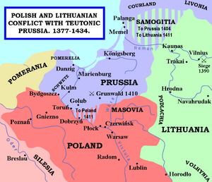 In December 1408, Władysław and Vytautas held strategic talks in Navahrudak Castle, where they decided to foment a Samogitian uprising against Teutonic rule to draw German forces away from Pomerelia. Władysław promised to repay Vytautas for his support by restoring Samogitia to Lithuania in any future peace treaty.[37] The uprising, which began in May 1409, at first provoked little reaction from the Knights, who had not yet consolidated their rule in Samogitia by building castles; but by June their diplomats were busy lobbying Władysław's court at Oborniki, warning his nobles against Polish involvement in a war between Lithuania and the Order.[38] Władysław, however, bypassed his nobles and informed new Grand Master Ulrich von Jungingen that if the Knights acted to suppress Samogitia, Poland would intervene. This stung the Order into issuing a declaration of war against Poland on 6 August, which Władysław received on 14 August in Nowy Korczyn.[38]
