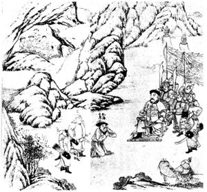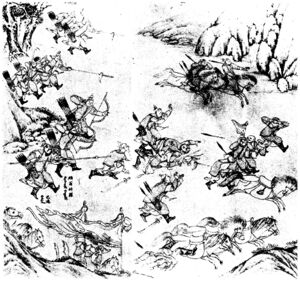 Early in 1583, Nurhaci obtained from Ming general Li Chengliang the right to succeed his father as a minor Jurchen chieftain.[4] He went to war with Nikan Wailan and forced him to flee to the Ming dynasty, where he was eventually executed. Nurhaci continued to expand his influence by steadily wiping out smaller tribes while at the same time currying favor with the Ming. In 1589, he endeared himself to the Ming by rescuing several kidnapped Chinese and delivering them to Ming authorities, an act which earned him the title of assistant commissioner-in-chief.[1] He consolidated his relationship with the Ming by personally leading tributary missions to the Ming court until 1611,[7] and was seen in by the Ming a loyal subject.[8] He returned Ming captives back to the proper authorities, and even offered to fight against the Japanese invasions of Korea (1592–1598). His offer to fight against the Japanese was denied due to misgivings from the Koreans,[9] but the Ming awarded Nurhaci the title of dragon-tiger general (龍虎將軍) along with the Hada leader.[10]
