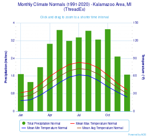 | بيانات المناخ لـ Kalamazoo Battle Ck Intl Ap, MI, 1991–2020 normals, extremes 1887-present | |||||||||||||