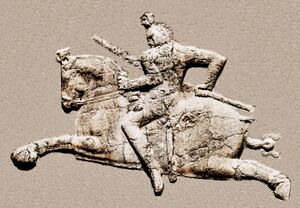 Possible Kushano-Sasanian plate, excavated in Rawalpindi, Pakistan, 350-400 CE.[16] British Museum 124093.[17][18]