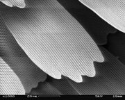 The wings, head, and parts of the thorax and abdomen of Lepidoptera are covered with minute scales, a feature from which the order derives its name. Most scales are lamellar, or blade-like, and attached with a pedicel, while other forms may be hair-like or specialized as secondary sexual characteristics.[30]