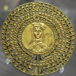 Eudoxia and Valentinian III married on 29 October 437, in Thessalonike, their marriage marking the reunion of the two halves of the House of Theodosius. The marriage was recorded by Socrates of Constantinople, the Chronicon Paschale and Marcellinus Comes.[3] In 439, Eudoxia was granted the title of Augusta, with the birth of their first daughter Eudocia. They also had a second daughter, Placidia.[4] The births and eventual fates of the two daughters were recorded by Priscus, Procopius, John Malalas and the Chronicon Paschale.[3]