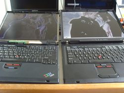 Two IBM ThinkPad laptop screens viewed at an extreme angle.