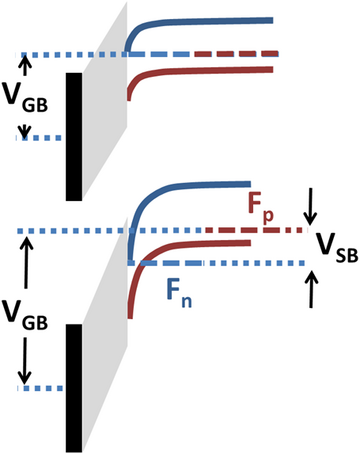 مع جهد البوابة الكافي، يتم دفع حافة نطاق التكافؤ بعيداً عن مستوى فيرمي، ويتم دفع الثقوب من الجسم بعيداً عن البوابة.