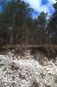 The base of the Maastrichtian Stage is at the first appearance of ammonite species Pachydiscus neubergicus. At the original type locality near Maastricht, the stratigraphic record was later found to be incomplete. A reference profile for the base was then appointed in a section along the Ardour river called Grande Carrière, close to the village of Tercis-les-Bains in southwestern France.[8][1] The top of the Maastrichtian Stage is defined to be at the iridium anomaly at the Cretaceous–Paleogene boundary (K–Pg boundary), which is also characterised by the extinction of many groups of life.[9]