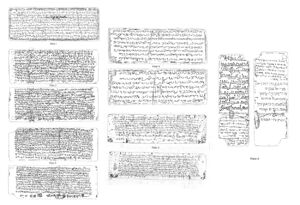 The origin of Malayalam remains a matter of dispute among scholars. The mainstream view holds that Malayalam descends from early Middle Tamil and separated from it sometime between the 9th and 13th centuries.[11] A second view argues for the development of the two languages out of "Proto-Dravidian" or "Proto-Tamil-Malayalam" in the prehistoric era,[12] although this is generally rejected by historical linguists.[13] The Quilon Syrian copper plates of 849/850 CE are considered by some to be the oldest available inscription written in Old Malayalam. However, the existence of Old Malayalam is sometimes disputed by scholars.[14] They regard the Chera Perumal inscriptional language as a diverging dialect or variety of contemporary Tamil.[14][15] The oldest extant literary work in Malayalam distinct from the Tamil tradition is Ramacharitam (late 12th or early 13th century).[16]