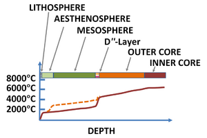 درجة حرارة الأرض مقابل العمق. المنحنى المتقطع: الحمل الحراري للوشاح متعدد الطبقات. المنحنى المتصل: الحمل الحراري للوشاح الكامل.[7]  |