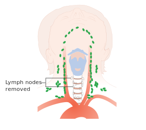 يعتبر استئصال الغدة الدرقية الكلي مع تشريح العنق الثنائي المعيار الذهبي لعلاج سرطان الغدة الدرقية اللبي ، وهو الوسيلة الأكثر تحديدًا لتحقيق الشفاء للمرضى دون وجود نقائل بعيدة أو تورط عقدي واسع النطاق. تشمل مخاطر الجراحة فقدان التحكم في الصوت ، أو تلف الأعصاب الذي لا يمكن إصلاحه ، أو الوفاة ، أو الحاجة إلى إجراء عملية ثانية لتنظيف ما تبقى من العقد الليمفاوية المريضة المتبقية إذا كانت خزعة العقدة الحارسة إيجابية لانتشار السرطان. يمكن أن تكون الجراحة المكثفة فعالة عندما يتم اكتشاف الحالة مبكرًا ، ولكن لا يزال هناك خطر من تكرارها ، خاصة في المرضى الذين يعانون من الغدد الليمفاوية الإيجابية المتعددة أو الغزو خارج المحفظة.[1][7] حوالي نصف المرضى لديهم ورم خبيث في العقد الليمفاوية الإقليمية في وقت التشخيص.[4]