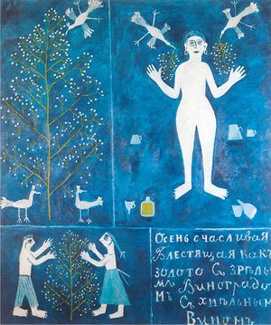 - Marevna, "Smokers" showing Ballet owner Serge de Diaghilev (بالوسط) مع جان كوكتو (إلى يساره)، ناتاليا گونچاروڤا (يسار) وزوجها ميخائيل لاريونوڤ (يمين)، (انزلق إلى ثالث لوحة).