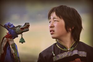 Yellow shamanism defines a distinct form of shamanism practiced in Mongolia and Siberia. The term "yellow" in "Yellow Shamanism" is derived from "Yellow Buddhist"; more commonly known as Tibetan Buddhism, this style of Shamanism integrated elements of ritual practice and traditional Buddhist customs.[6] The Gelukpa (or Geluk) school of Buddhism, otherwise known as "Yellow Hat," is one of four major schools (Nyingma, Kagyu, Sakya) established by the early 1400s in Tibetan Buddhism. Similar to the other Buddhist schools, Geluk combined the philosophy and cosmology of Mahayana Buddhism and incorporated distinctive qualities from the Vajrayana teachings to develop and cultivate its own traditions. The term Geluk means, "Order of excellence" or "Virtuous order" in the Tibetan language, which reflects the belief in the institution of the Tulku (incarnate lama) unique only to Tibetan Buddhism. Additionally, the color yellow is a significant color in Tibetan Buddhism, as it represents the color closest to daylight and symbolizes the humility Gautama Buddha displayed in choosing a color previously worn by criminals.[7] Another distinctive quality of Tibetan Buddhism are the yellow pandita hats typically worn by monks.[8][9] The term "yellow shamanism" also serves to distinguish it from a form of shamanism not influenced by Buddhism (according to its adherents), called black shamanism.[10]